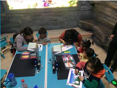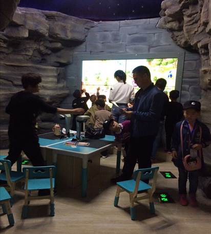让参观的观众特别是青少年学生亲自体验智慧恐龙D.I.Y涂鸦系统,用户在特定涂鸦模版上进行自由发挥创作,在纸上画出自己心目中的恐龙,通过设备扫描可以进行自动图像识别,然后在大屏幕上显示出自己所画恐龙的模样,实现跑动、吼叫等动作响应,根据不同恐龙的食性,来点击不同的食物,使其慢慢长大,并且用户可自主选择任意一种3D恐龙形象,通过3D打印系统打印出恐龙纪念品。这种集娱乐性,科普性为一体的互动环节,受到大家的喜爱。