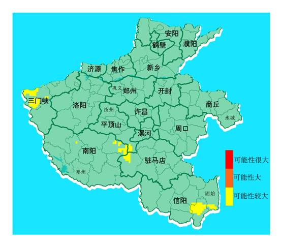 今晚到明天,地质灾害预警预报达到黄色预警的地区为:三门峡北部,平顶山、信阳东南部,南阳东北部及北部局部,驻马店西北部,固始南部,发生地质灾害的可能性较大。